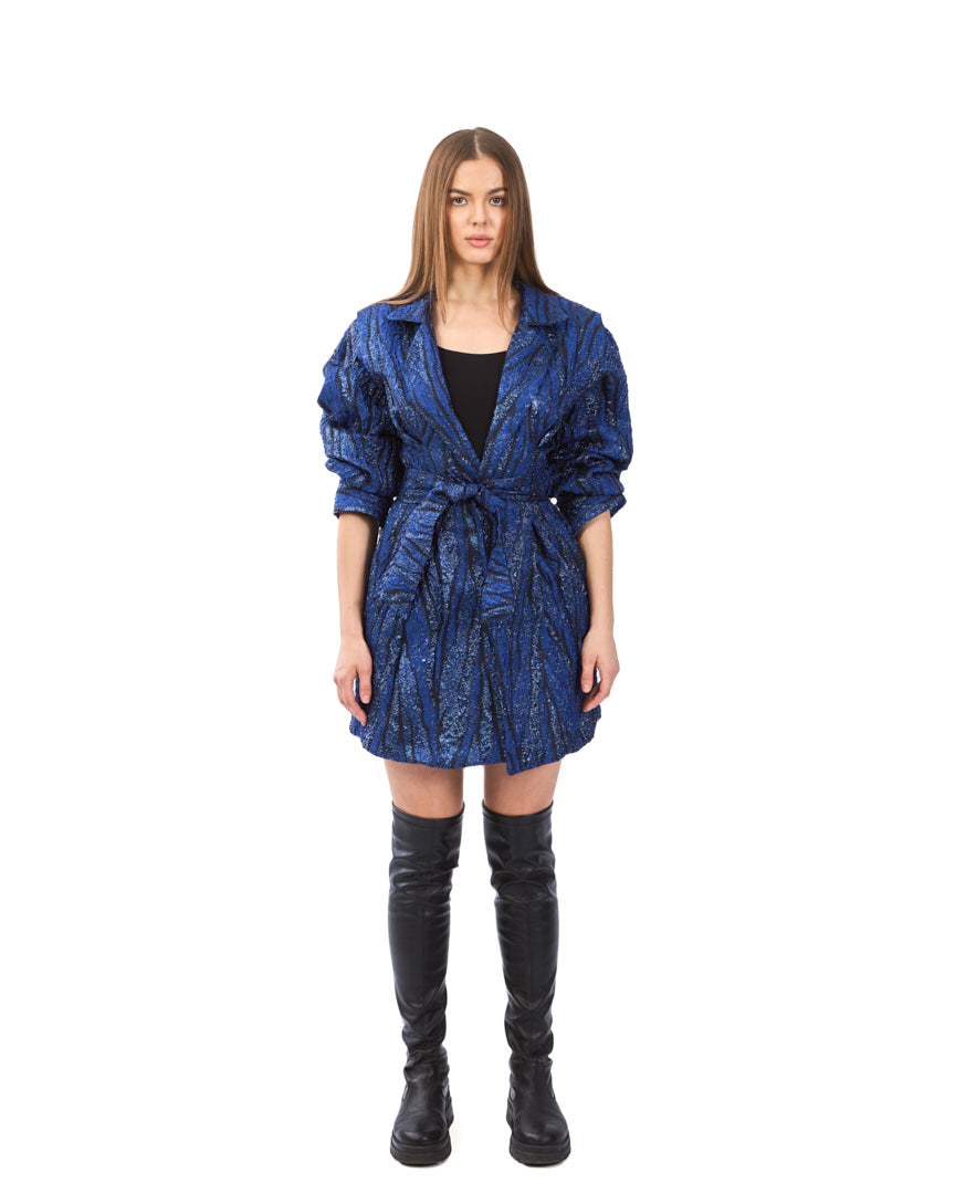 A striking textured jacket in deep shimmering blue, designed with voluminous sleeves, a structured collar, and a belted waist that creates a bold, sculpted silhouette.